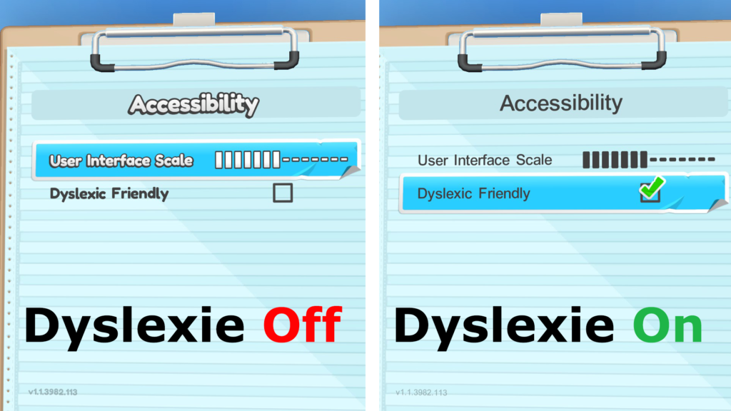 D’ailleurs, puisqu’il en est question, le jeu propose également un menu Accessibilité, qui permet de régler la taille des éléments à l’écran ainsi qu’une police alternative, plus adaptée aux personnes dyslexiques. N’étant pas moi-même dyslexique, j’ai donc fait appel à notre Sharksymphonie national afin d’avoir son retour sur le sujet. La police proposée est effectivement plus facilement lisible, toutefois elle aurait pu l’être davantage, notamment en changeant la forme de certaines lettres qui se ressemblent (par exemple les b et les d ou les q et les p, qui dans certaines polices sont identiques, symétrie axiale mise à part).