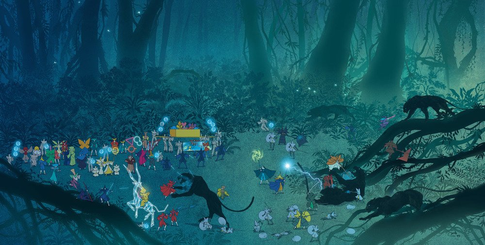 Quand je dis typique, ce n’est pas pour dire que ce genre de doubles-pages arrivent par moment dans le récit mais bien que toutes les pages ressemblent à ça. Vous n’aurez pas une bulle de dialogue de tout le récit, ni de case, ni de texte quelconque. Une petite introduction de quelques lignes au début puis la vingtaine de doubles-pages suivante ne sera composée que de ces majestueuses scènes dans lesquelles les personnages, bien que centraux et mis en valeur, sont surplombés par leur environnement. On peut par ailleurs, entre cette image et la vidéo présentée plus haut, avoir un aperçu des nombreuses influences de l’artiste. En effet l’utilisation de l’informatique lui a permis de faire des compositions mélangeant des univers à priori opposés sans que cela ne choque l’œil. On peut citer notamment Tron pour les lumières néons, Miyazaki pour le côté onirique, le film Dune pour les représentations du désert ou encore le jeu Journey qui a servi autant de référence graphique que narrative.