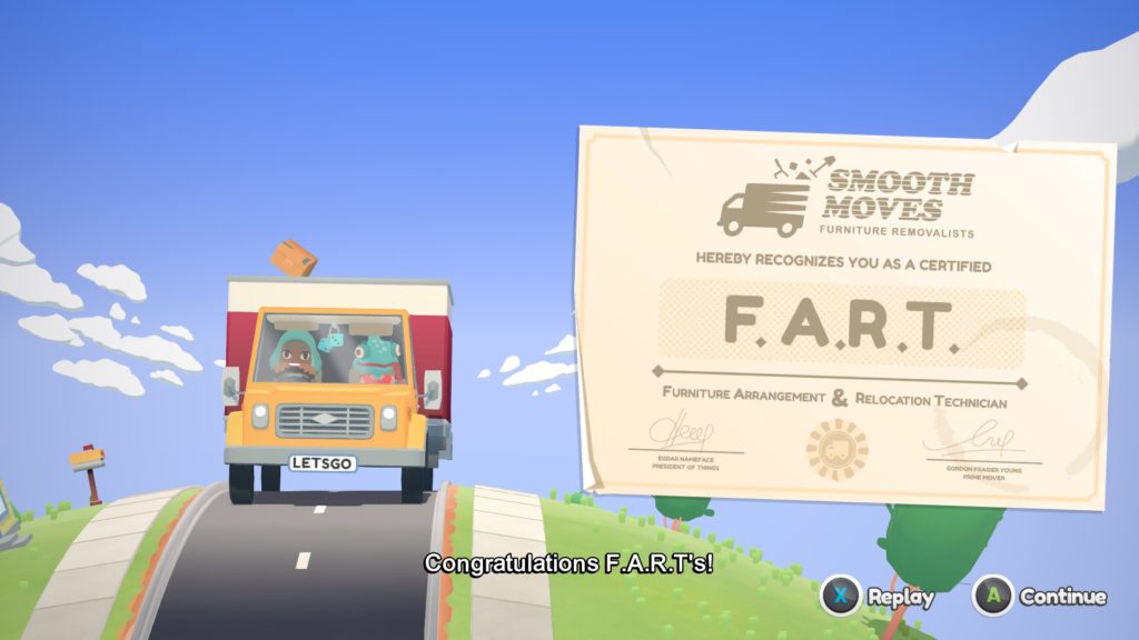 Enfin, je trouve Moving Out très amusant. Les dialogues sont drôles, notre façon de déménager les meubles est toujours aussi comique après *vérifie* 14h de jeu, l’histoire avance progressivement mais intelligemment et j’ai fini par me retrouver à tenter d’obtenir toutes les médailles d’or et réussir tous les objectifs bonus alors que, de base, je n’ai pas tendance à essayer à ce point.